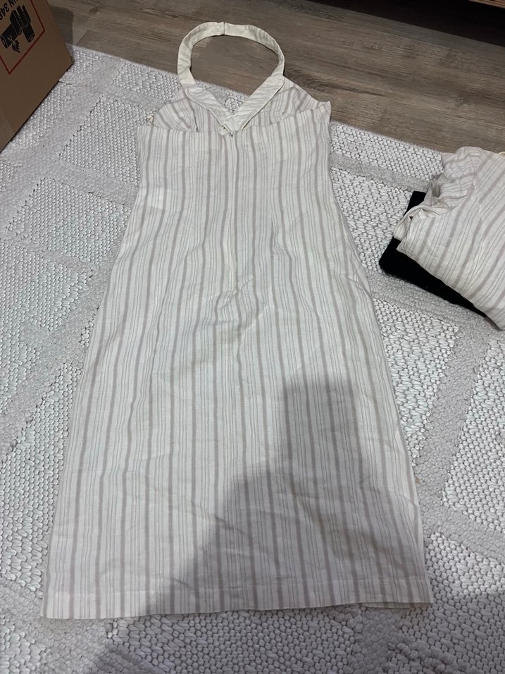 Beyaz zemin üzerine gri çizgilerle tasarlanmış, askılı ve hafif nefes alabilen kumaştan kadın günlük elbise.