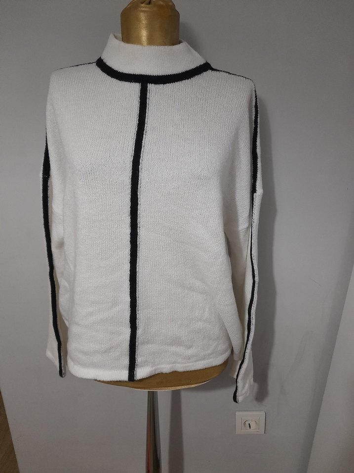 Gri çizgili beyaz triko kazak, uzun kollu, yuvarlak yaka ve rahat kesimlidir. Günlük kullanıma uygun modern bir tasarıma sahiptir.