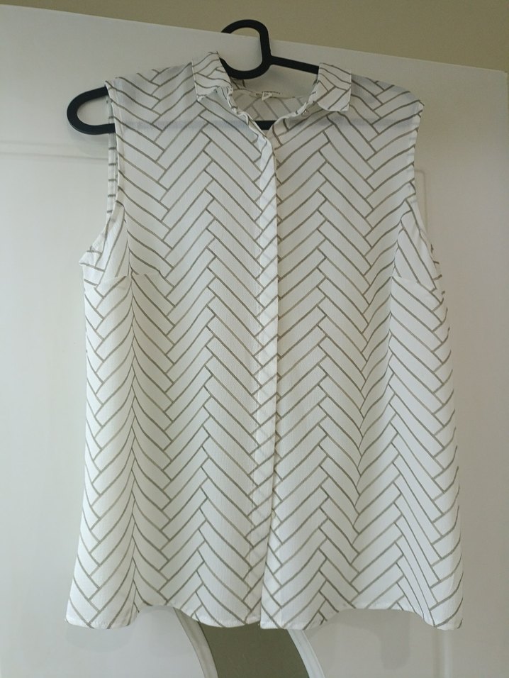 Gri çizgili beyaz kolsuz gömlek, yakalı ve düğmeli. Orta uzunlukta, düz kesim ve yumuşak sentetik kumaştan üretilmiştir. Rahat günlük kullanım için uygundur.
