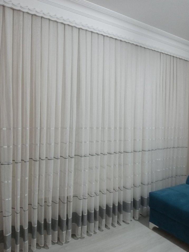 Gri çizgili desenlere sahip beyaz modern perde, yumuşak kumaşıyla odanıza şık bir dokunuş katıyor.
