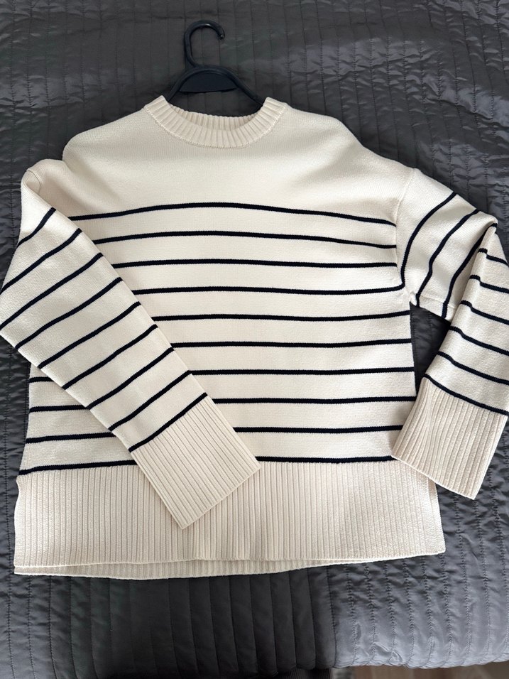 Bu kadın kazak, yuvarlak yaka ve uzun kollu olup, bol kesimdir. Yünden üretilmiş, beyaz ve gri çizgili desene sahiptir, günlük rahat kullanım için uygundur.