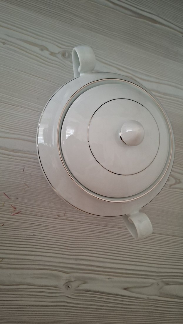 Gri çizgili beyaz porselen şekerlik, klasik tasarıma ve pürüzsüz yüzeye sahiptir. İki kulplu ve kapaklıdır. ️