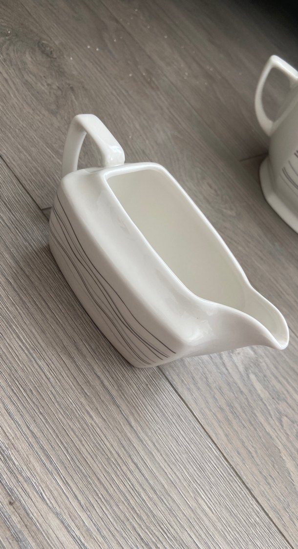 Gri çizgili beyaz porselenden yapılmış, kulplu ve dökme ağızlı çağdaş tasarım sosluk.