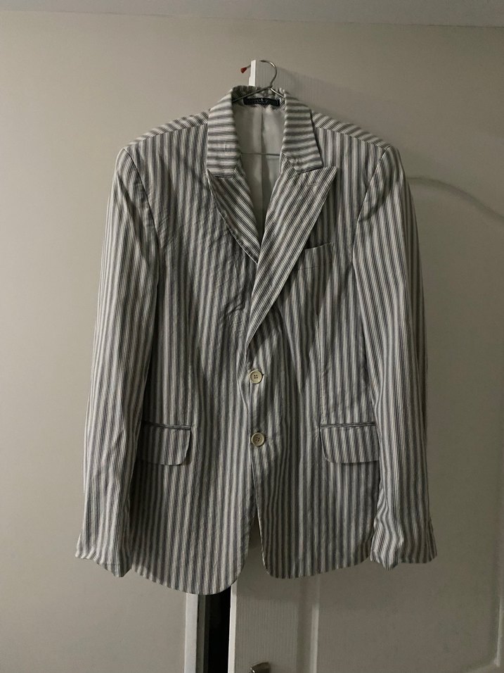 Gri çizgili, düğmeli erkek ceket. Normal boy ve regular fit, uzun kollu, ofis kullanımı için uygundur. ️