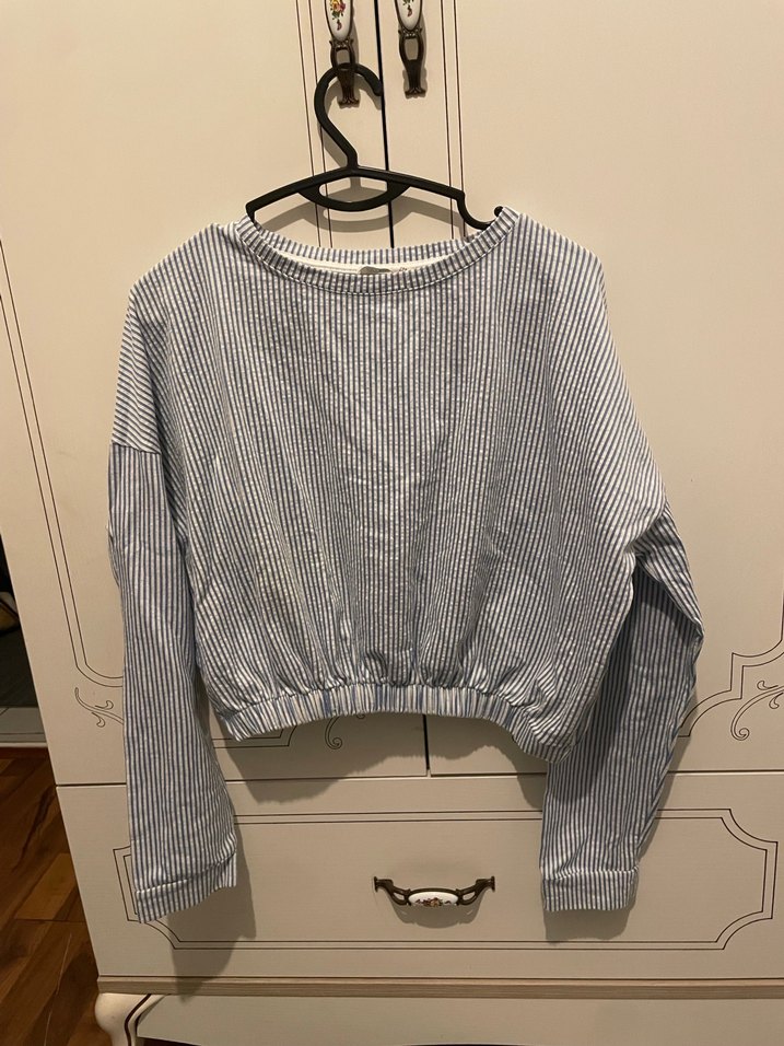 Uzun kollu, yuvarlak yakalı, gri çizgili, pileli ve bol kesim bluz. Rahat sokak stili için uygundur.