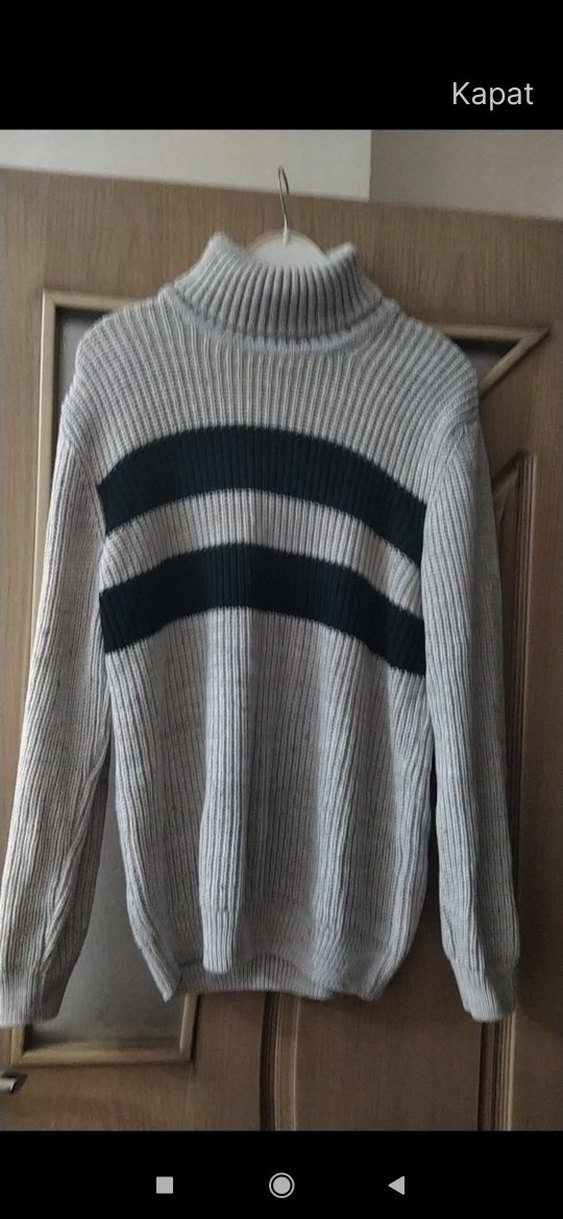 Boğazlı, uzun kollu, gri çizgili örme kadın kazak. Rahat kesimi ve midi uzunluğu ile günlük sokak stiline uygundur.