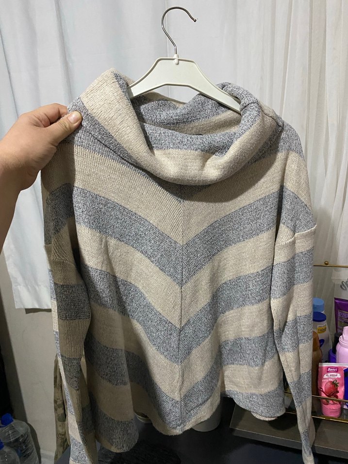 Gri çizgili, boğazlı ve uzun kollu triko kazak, bol kesim ve midi boyda. Günlük sokak stili için rahat ve sıcak bir seçimdir.
