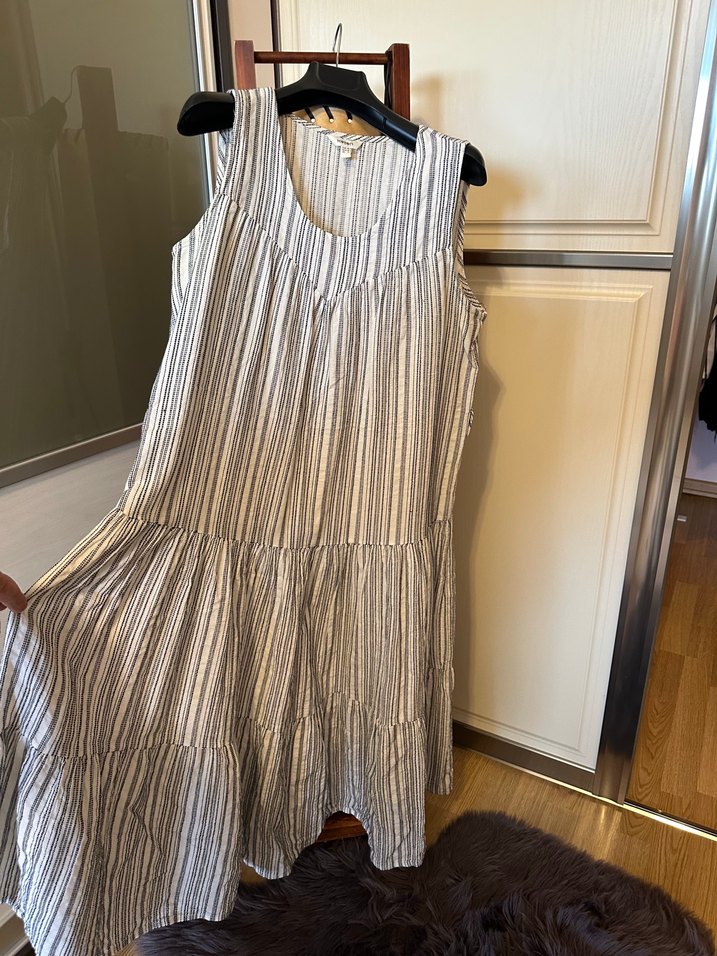Keten kumaştan, gri renkte, çizgili, kolsuz ve bol kesim uzun elbise. V yaka ve pile detaylarıyla bohem tarzda, günlük kullanıma uygun.