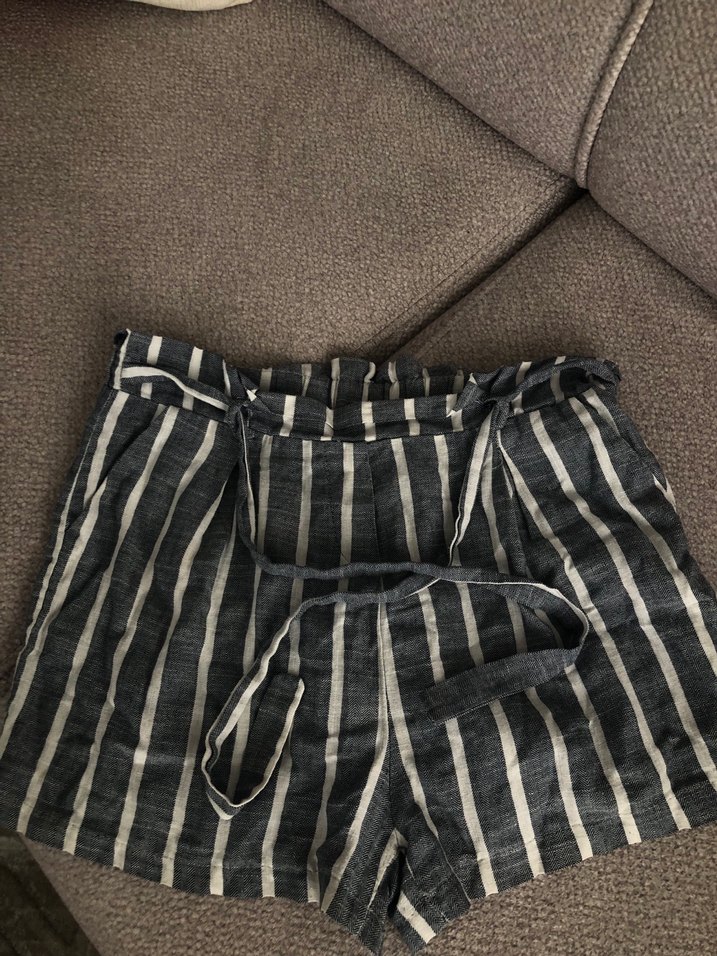 Gri çizgili keten hamile şortu, pile detaylı ve bol kesim midi boyda, rahat günlük kullanım için uygundur. Bohem tarzda, konforlu bir parça.