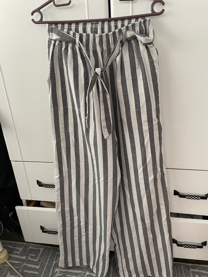 Gri çizgili keten pantolon, bol kesim ve pile detaylı, bağlamalı kemerle rahat bir sokak stili sunar. Günlük kullanım için uygundur.