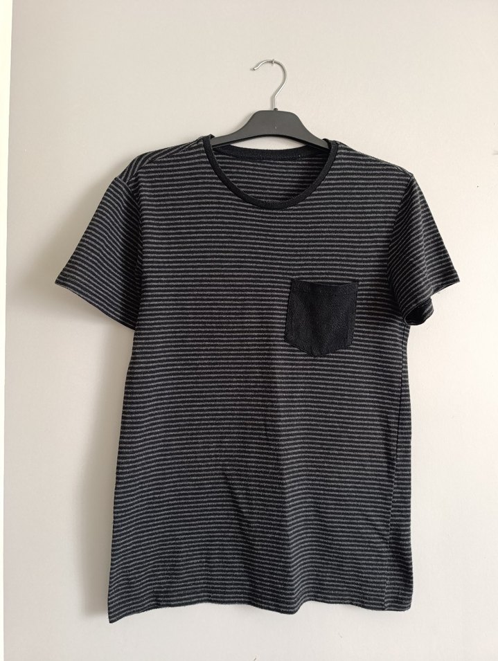Kısa kollu, bisiklet yaka ve bol kesim erkek tişörtü. Yumuşak sentetik kumaştan, gri çizgili ve pileli siyah cep detaylıdır. Günlük kullanım için uygundur.