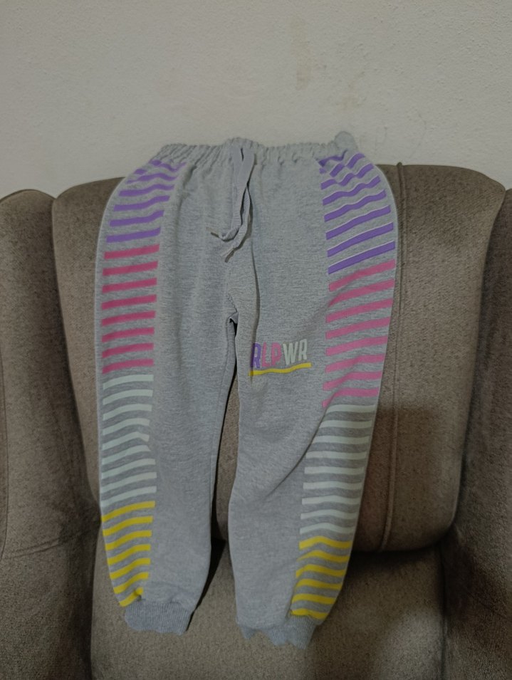 Rahat kesim gri eşofman altı, renkli çizgili detaylar ve fermuarlı ceplerle, yumuşak kumaştan, spor ve günlük kullanım için uygun. ♀️