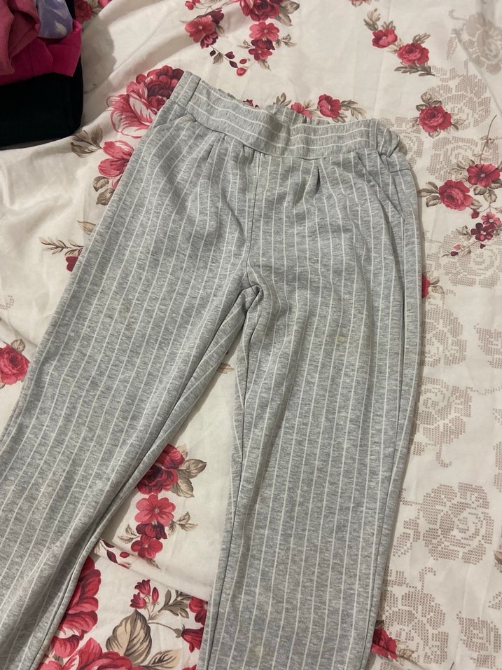 Gri çizgili keten kumaştan, pileli ve bol kesim midi boy çocuk pantolon. Rahat ve günlük kullanım için uygun.