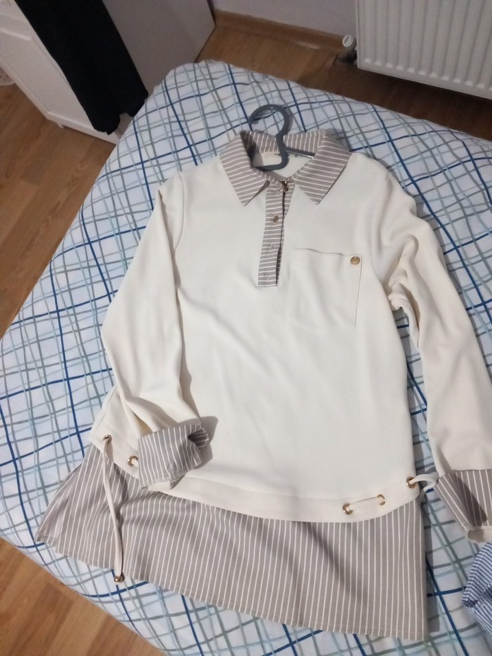 Kadın gömlek, gri çizgili yakası, manşetleri ve etek ucu detaylarıyla. Uzun kollu, düğmeli ve mini etek görünümlü kısa kesim. Yumuşak sentetik kumaş, günlük kullanıma uygun.