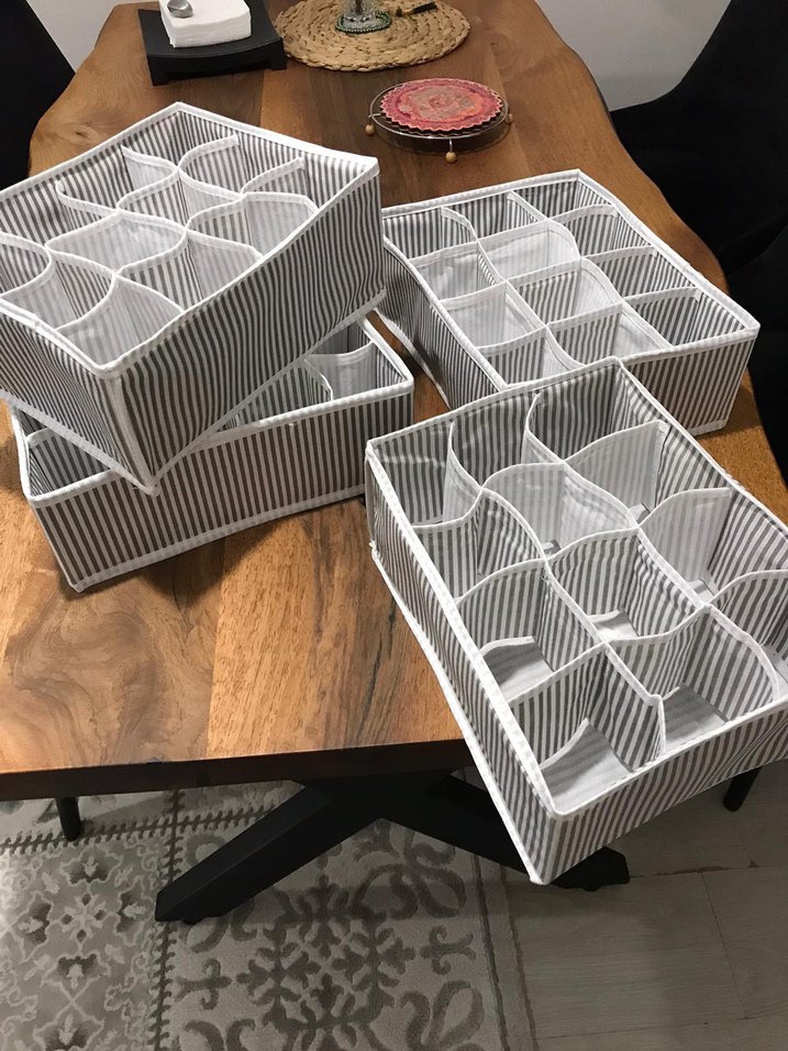 gri çizgili dolap düzenleyici, yumuşak kumaştan yapılmış ve birden fazla bölmesiyle eşyalarınızı düzenlemenizi sağlar. 4 ürün vardır