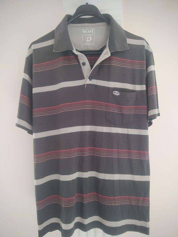 Gri tonlarda çizgili, düğmeli, kısa kollu ve yakalı erkek polo tişört. Sentetik kumaştan, cepli ve bol kesimdir. Günlük sokak stiline uygundur.