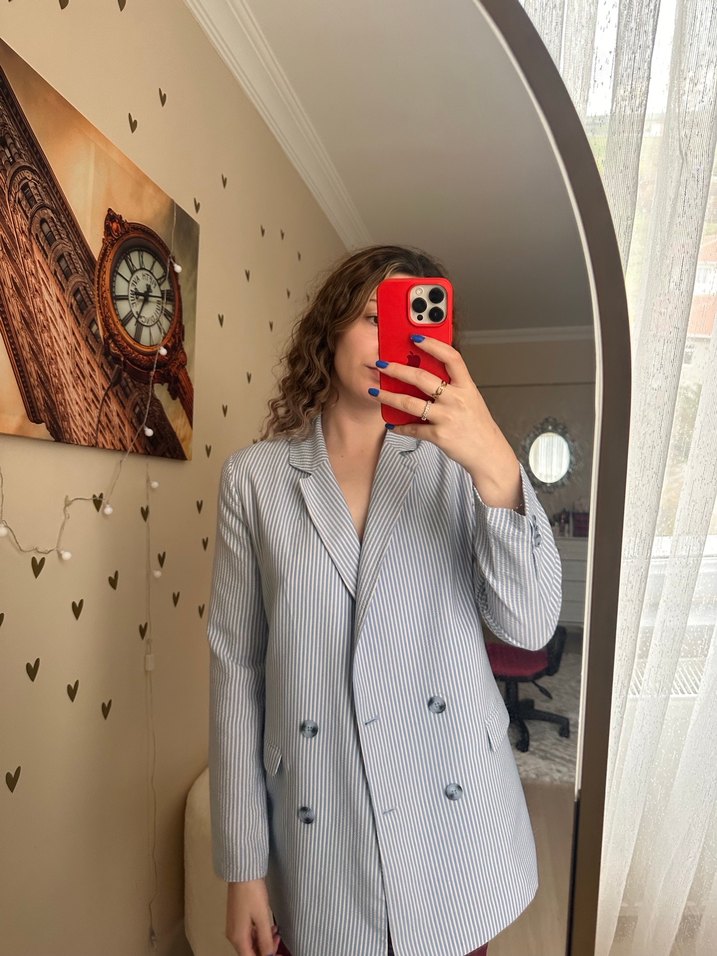Gri renkli, düğmeli ve uzun kollu blazer ceket. Denim kumaştan, çizgili ve hafif batik desenli, normal kesim ve midi boyda, ofis için uygun.