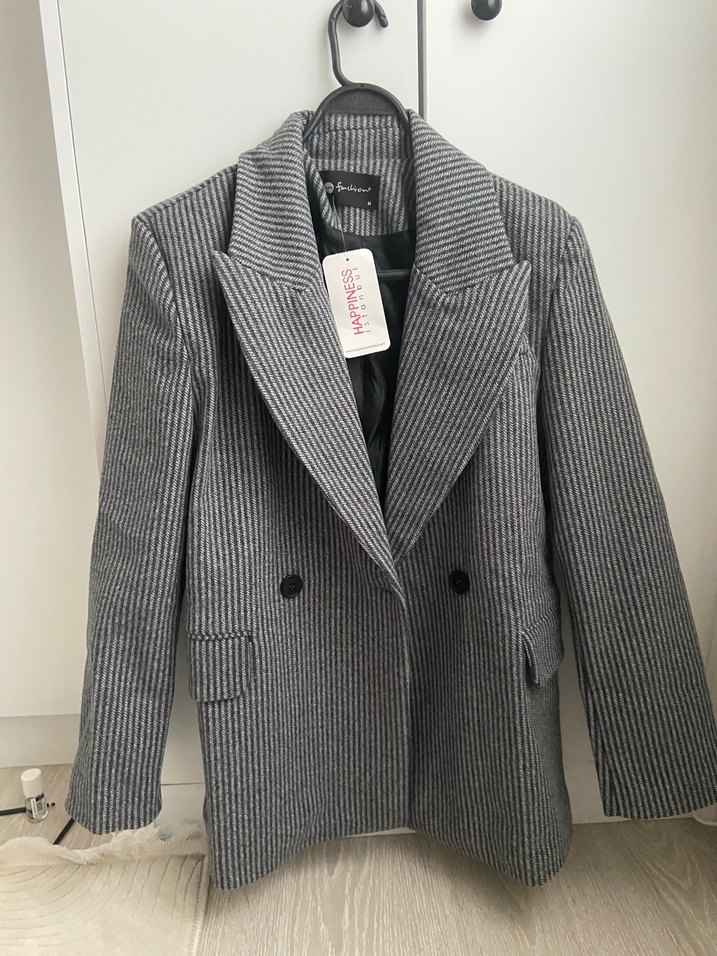 Gri çizgili, düğmeli kadın blazer. Yün kumaştan, normal kesim ve uzun kollu, ofis ve günlük kullanıma uygun.