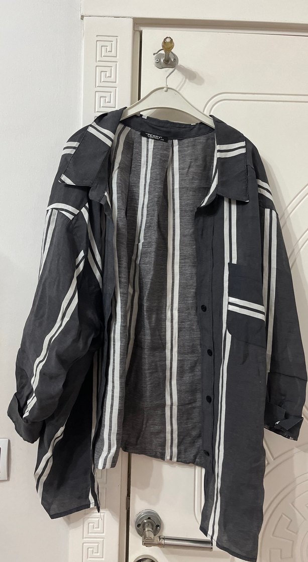 Gri çizgili, düğmeli kadın keten gömlek. Uzun kollu, notch yaka ve rahat kesimlidir. Günlük ve sokak stiline uygundur.