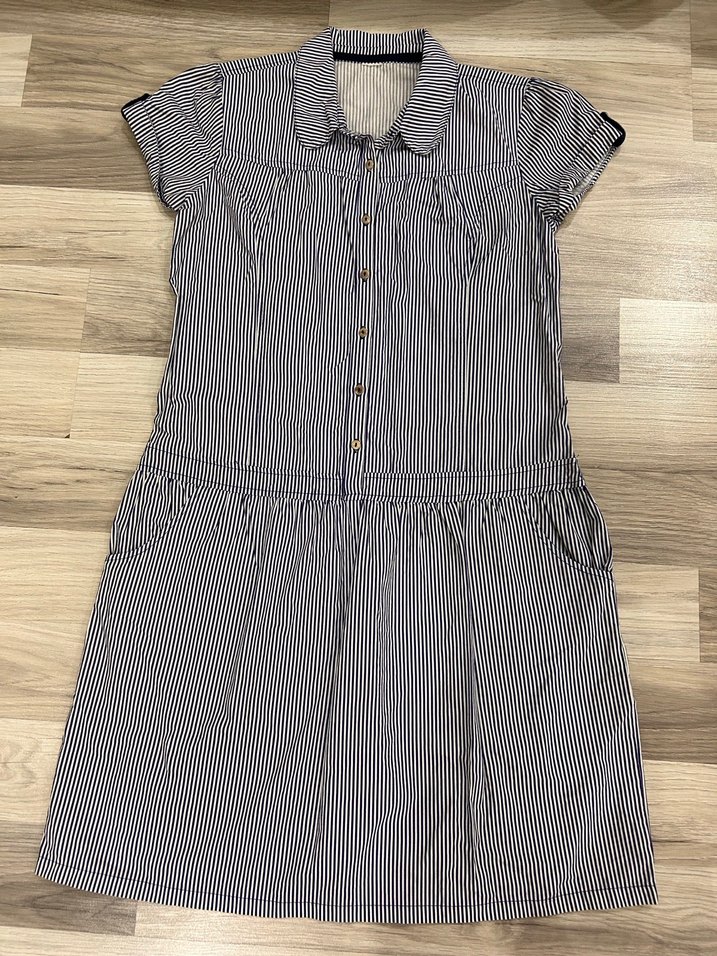 Gri Çizgili Düğmeli Kısa Kollu Elbise
