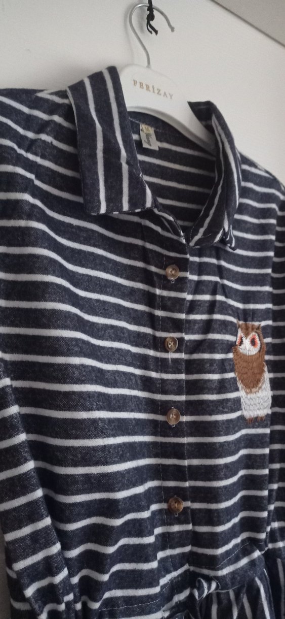 Gri çizgili diz üstü elbise, uzun kollu, yakalı ve düğmeli. Bol kesim, baykuş işlemeli, pamuk kumaştan casual sokak tarzı için uygun.