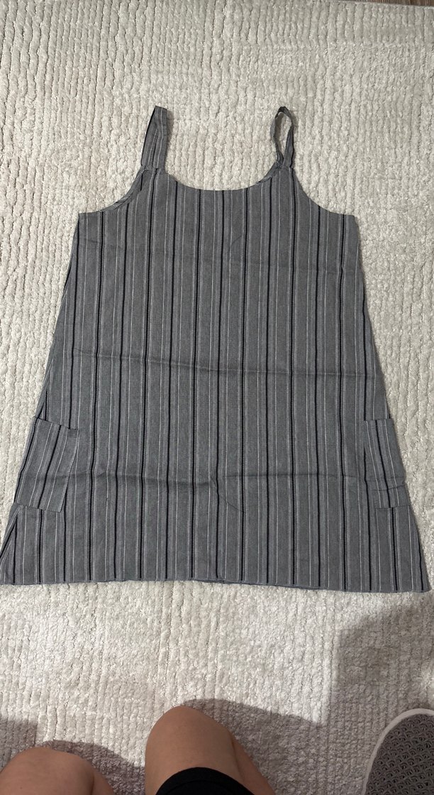 Gri çizgili,salaş kesim az giyildi fazlalıktır kısa boy askılı gri siyah beyaz çizgili defosu yok cepleri var resimde belirtildi l bedene kadar uygun