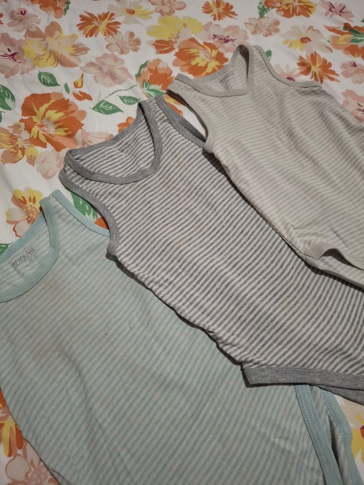 Farklı gri tonlarında, askısız yakalı, çizgili örme erkek bebek bodysuitleri. Yumuşak tekstil malzemeden üretilmiştir. Hafif lekeler var çıkartmadım ben. O yüzden uygun fiyatlı satıyorum. 3lü fiyatıdır
