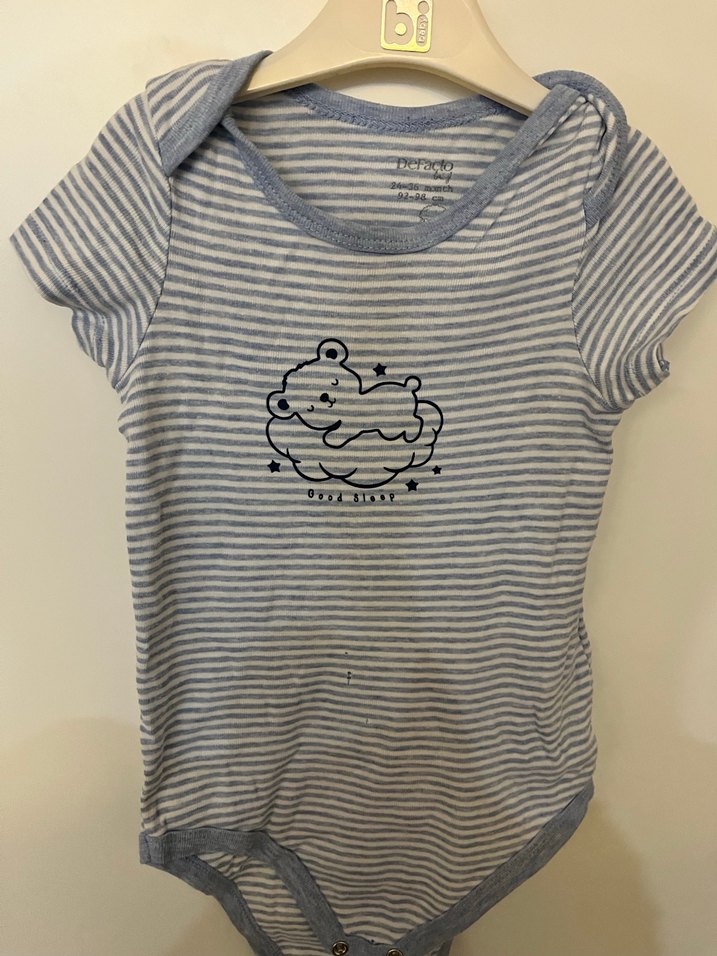 Gri çizgili erkek bebek kısa kollu body, pamuklu ve yumuşak kumaştan üretilmiştir. Düğmeli ve baskılıdır.