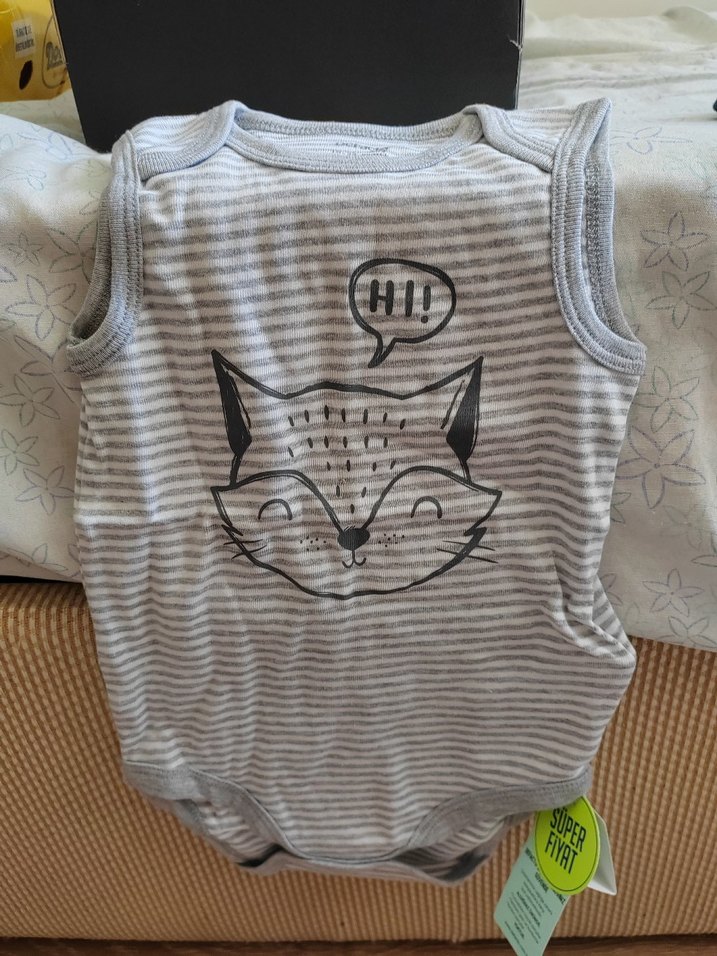 Yüksek yakalı, kolsuz gri çizgili bebek body. Örgü kumaş ve üzerinde "HI!" yazılı tilki baskısı bulunur. Trendy sokak stili için uygun, dar kesim.