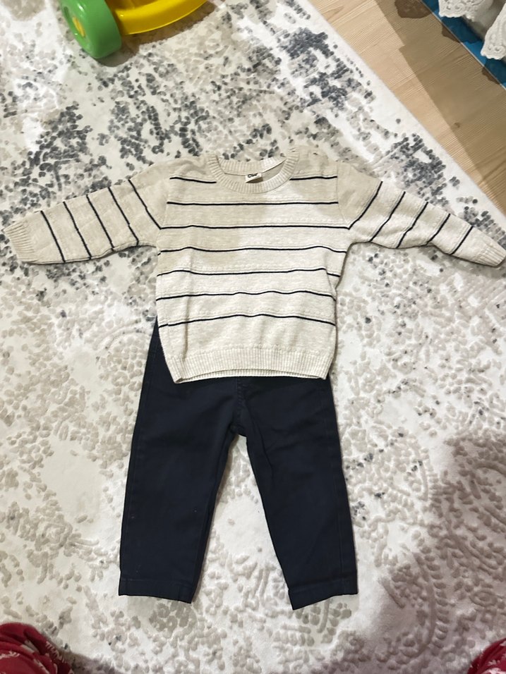Pamuklu, uzun kollu, yuvarlak yakalı ve ince çizgili örgü kazak ile koyu renk pantolondan oluşan bebek erkek takımı. Rahat ve sade tasarım.