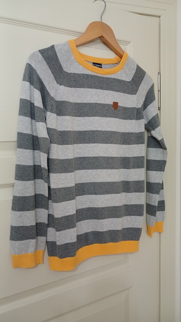 Uzun kollu, yuvarlak yaka erkek çocuk kazak. Yumuşak yün örgü, gri ve açık gri çizgili, sarı yakalı ve manşet detaylı, bol kesim.
