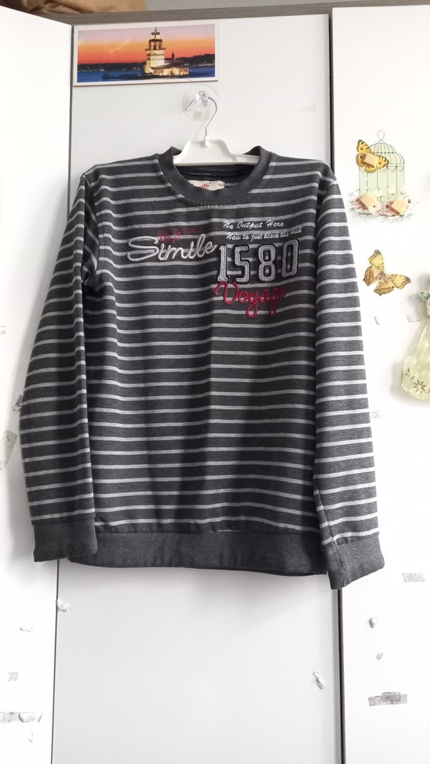 Bu erkek sweatshirtü uzun kollu ve yuvarlak yakalıdır, bol kesimlidir. Gri çizgili, örme dokuda ve 1580 sayılı baskılar içerir. Sentetik kumaştan yapılmıştır, trend sokak stiline uygundur. 14 yaş için az kullanılmış yeni iki koltuk arası 45 cm boy 59 cm