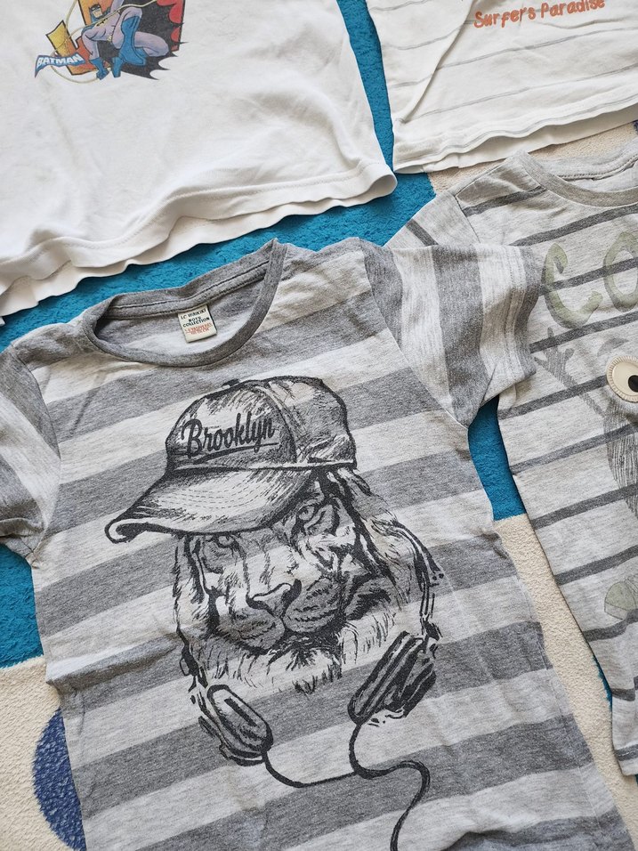 Gri çizgili ve baskılı kaplan figürlü, kısa kollu, bisiklet yaka, pamuklu örme kumaştan erkek çocuk tişörtü. toplu