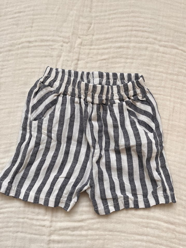 Kalıbı küçük. Yenidoğan bebeklere uygundur. Cepli ve keten kumaşı var. Yumuşak keten kumaştan, gri beyaz çizgili ve pile detaylı, bol kesim erkek şortu. Rahat ve günlük stil.