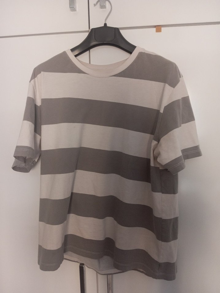 Geniş gri ve açık gri çizgilerle kısa kollu, yuvarlak yaka erkek tişörtü, rahat kesimli, yumuşak sentetik kumaştan, gündelik stil için uygun.