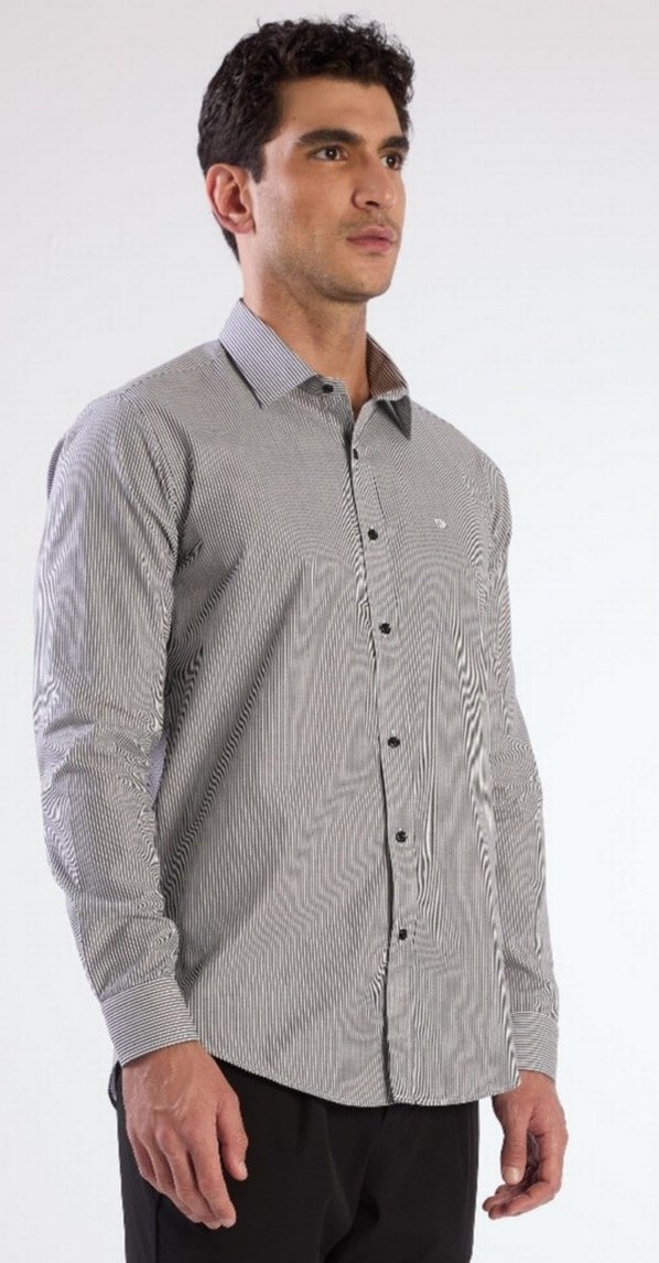 Gri çizgili, düğmeli uzun kollu ve regular fit erkek gömleği. Sentetik kumaştan üretilmiş olup, ofis kullanımı için uygundur.
