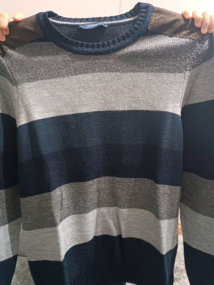 Fitted kesim, yuvarlak yaka ve uzun kollu bu erkek kazak, yumuşak yünden örülmüş ve geniş gri ile koyu çizgilere sahip. Rahat ve şık bir günlük stil sunar.