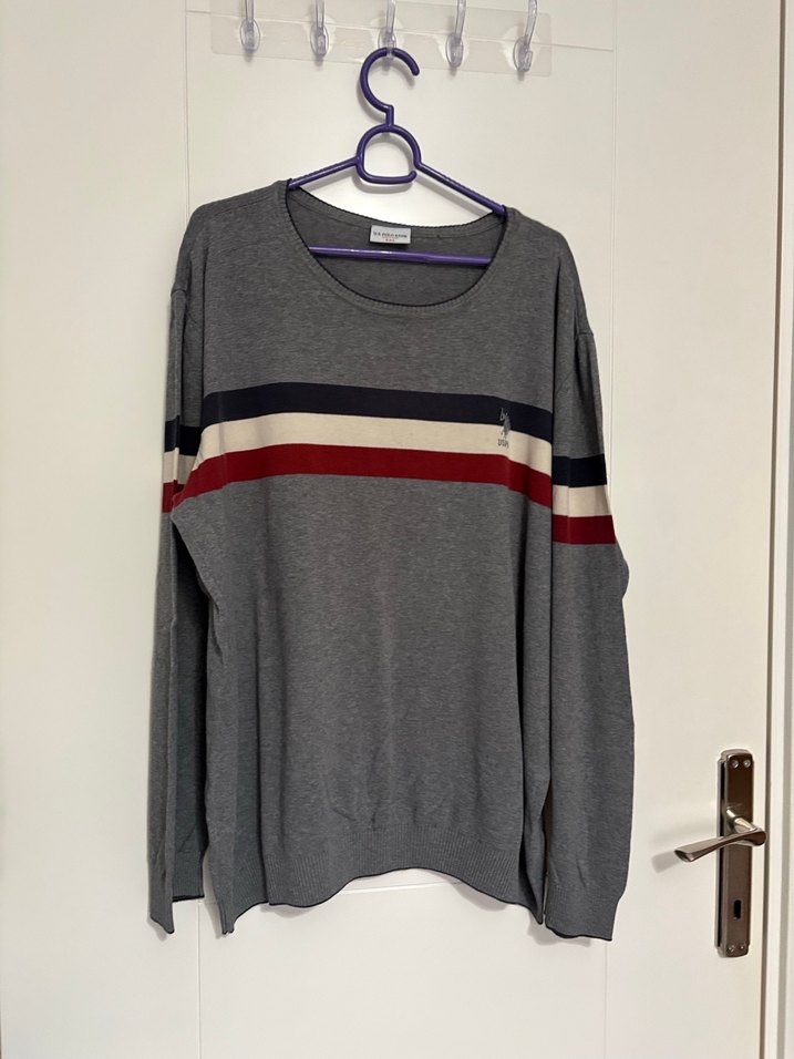 Pamuklu, uzun kollu, gri çizgili erkek triko kazak. Salaş kesim, bisiklet yaka ve günlük sokak stili için uygun.