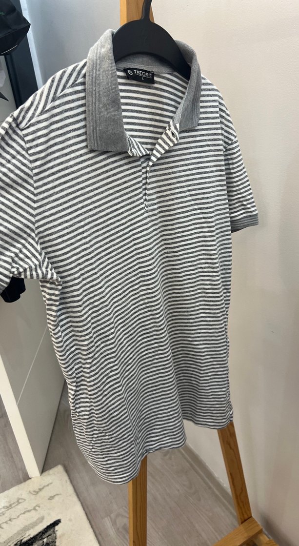 Bu erkek polo tişört kısa kollu, düğmeli yakalı ve çizgili tasarıma sahiptir. Gri renkte, ince kesim ve sentetik dokulu kumaştan üretilmiştir.