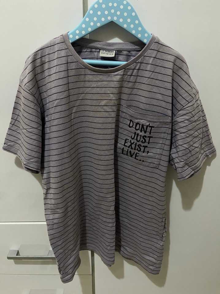 Gri renkli, kısa kollu ve geniş kesime sahip erkek tişörtü. Pamuklu kumaştan üretilmiş, göğüs cebinde 'DONT JUST EXIST, LIVE.' yazılı baskısı bulunur.