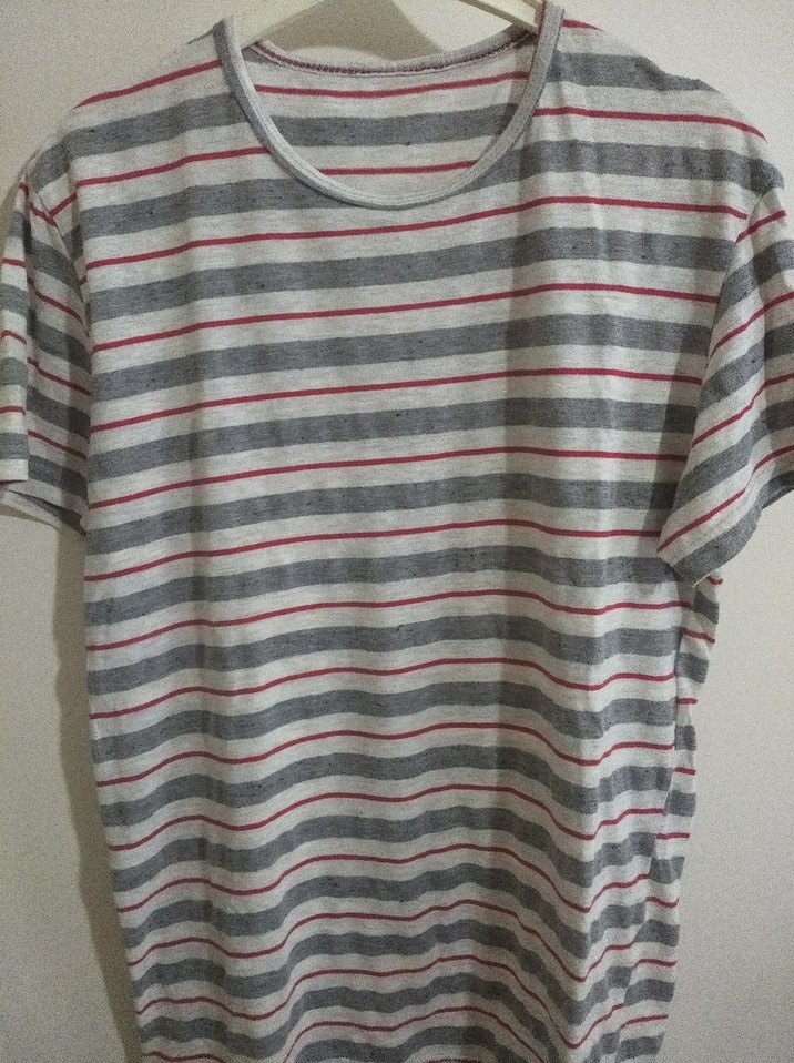 Kısa kollu, yuvarlak yakalı, bol kesim erkek tişörtü. Gri ve kırmızı çizgili desenli, sentetik yumuşak kumaştan yapılmıştır. Rahat sokak stili için uygundur.