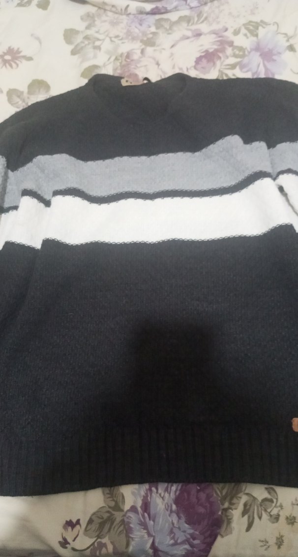 Gri ve beyaz çizgili, örgü dokulu erkek triko kazak. Yuvarlak yaka, uzun kollu ve bol kesim, rahat sokak stili için uygun.