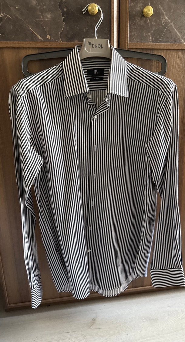 Gri renkli, uzun kollu, yakalı ve düğmeli önü olan çizgili erkek gömleği. Sentetik kumaştan, normal kesim ve ofis ile sokak stili için uygun. Üzerinde 'HEKOL' etiketi bulunur.