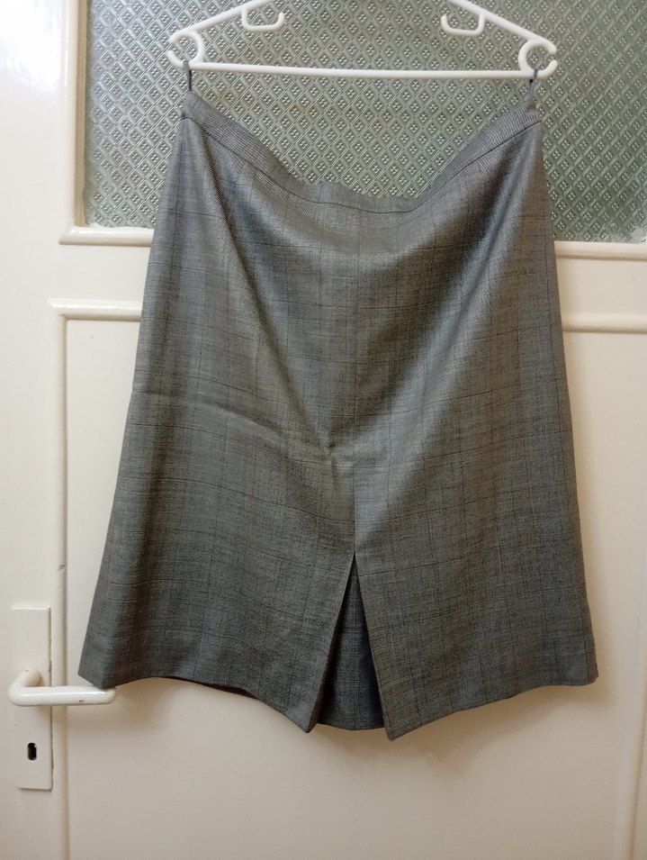 Gri renk, keten kumaştan midi boy hamile eteği. Drapeli tasarımı ve rahat kesimi ile ofis ortamına uygundur.