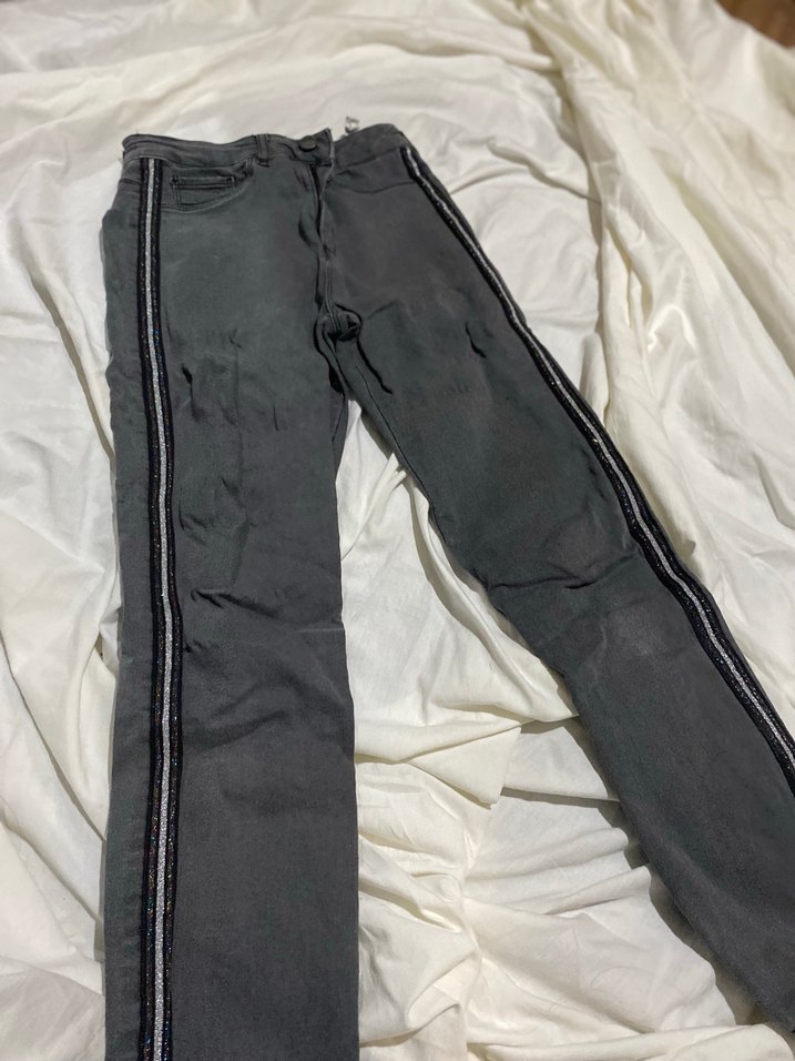 Gri renkli, çizgili yan detaylara ve fermuarlı özelliklere sahip, günlük kullanım için uygun, dar kesim kadın kot pantolon.