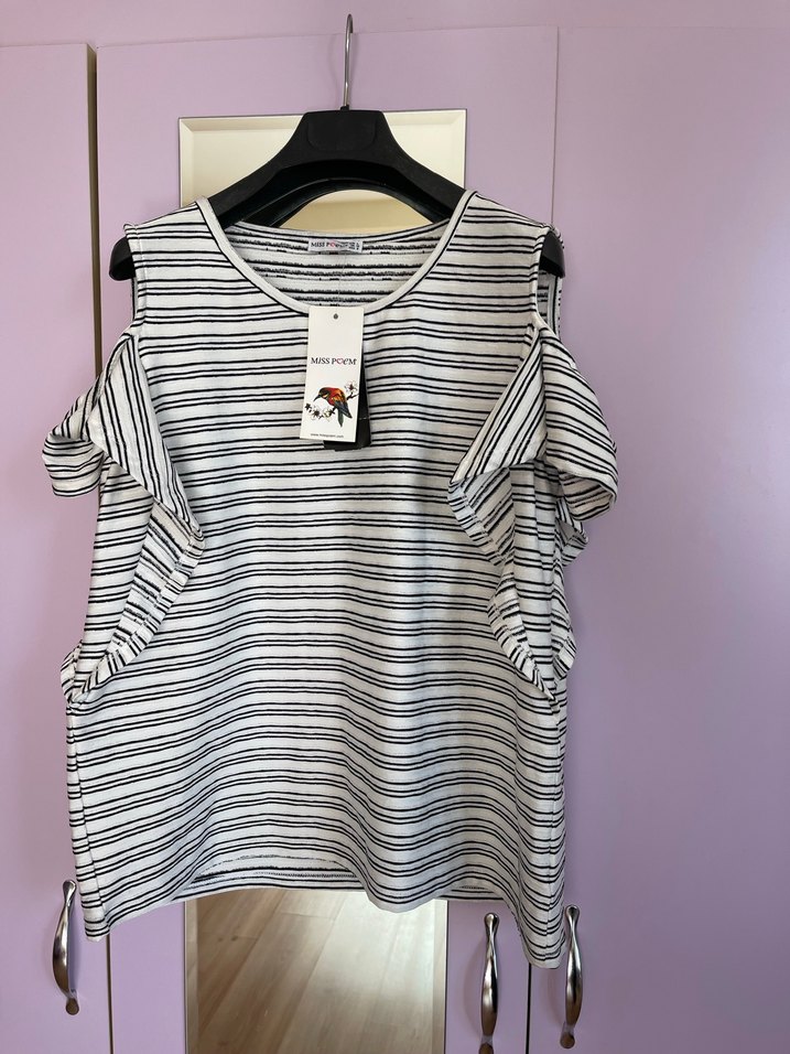 Gri pamuklu tişört, kısa kollu ve fırfırlı detaylara sahip. Salaş kesimi, yuvarlak yaka ve kısa boyu ile çizgili baskı bulunur. Rahat sokak stili için uygundur.