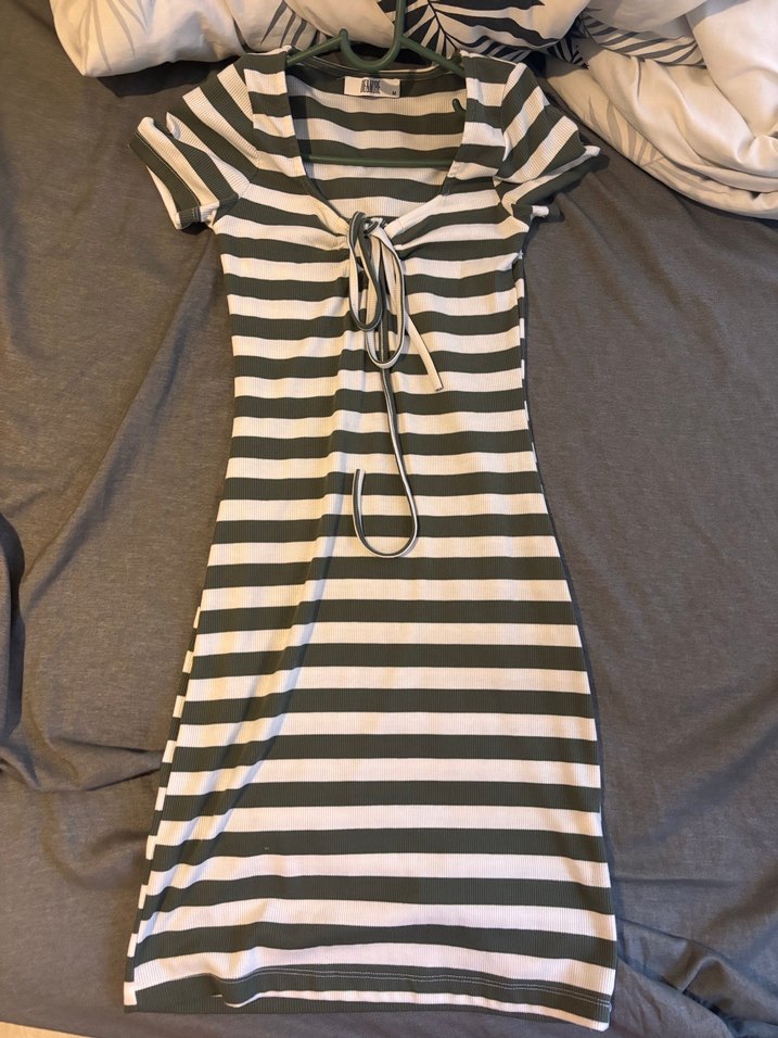 Yeşil ve beyaz çizgili, kısa kollu ve kayık yakalı bu midi elbise, ön kısmında drapeli bağcık detayına sahiptir. Yumuşak pamuk kumaştan üretilmiştir.