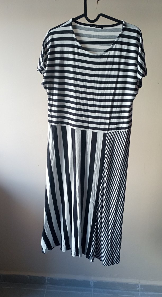 Gri tonlarda çizgili, pilili ve bol kesim hamile elbisesi. Kısa kollu, kayık yaka ve sentetik kumaştan üretilmiştir.