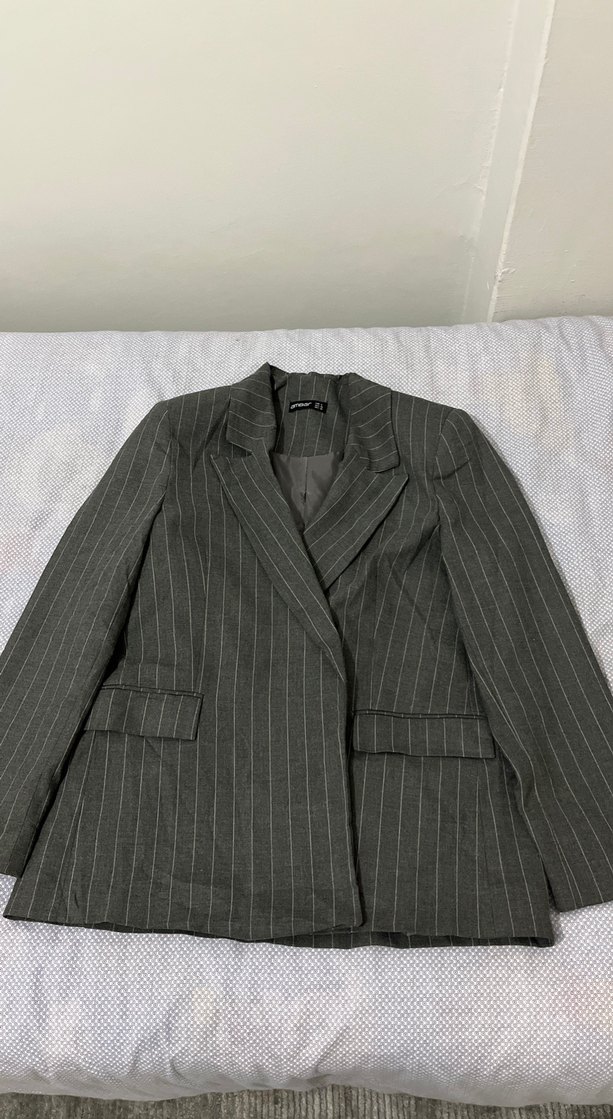 Gri çizgili, düğmeli kadın blazer ceket. Yumuşak keten kumaştan, uzun kollu ve normal kesimdir. Ofis için uygun, şık ve rahat bir modeldir. ✨
