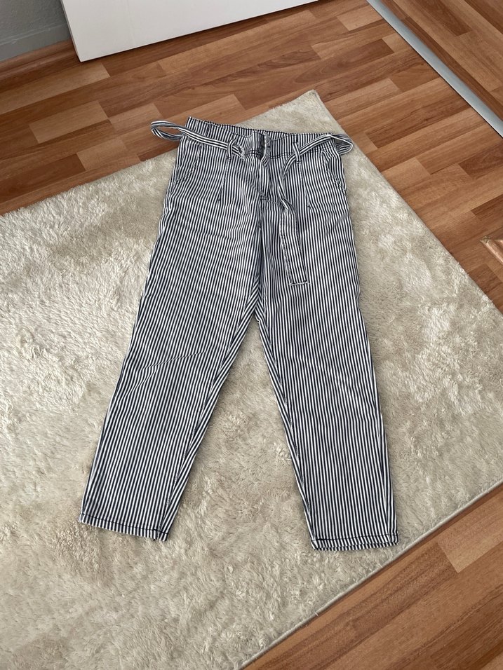 Gri çizgili, kemerli ve rahat kesimli denim pantolon. Midi boyda, günlük kullanıma uygun sokak stili pantolon.